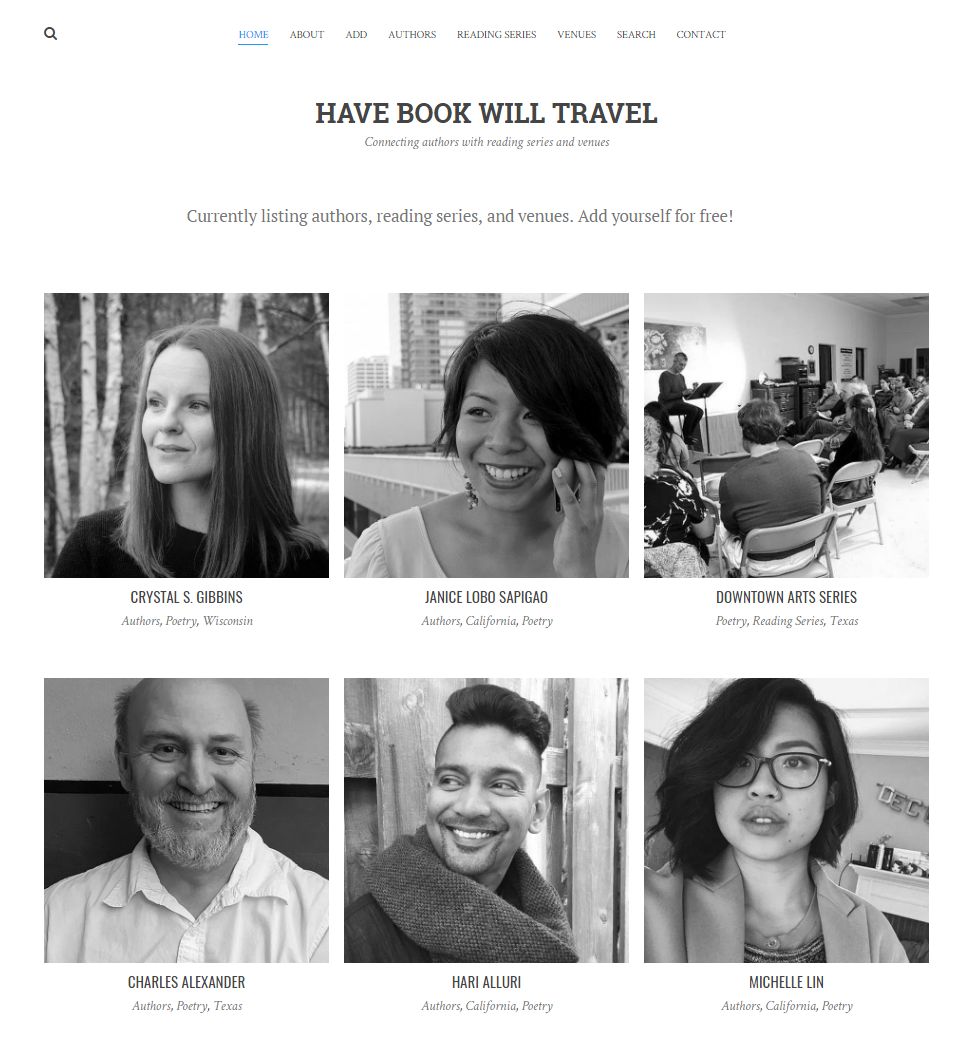 Have Book Will Travel (2016-)book tour / author event resourceA searchable database of authors willing to travel, reading series currently seeking guest writers, and venues available for booking events. By making booking fees, compensation, venue capacities, and reading series’s schedules more transparent, HBWT simplifies the process of planning a book tour or scheduling the lineup for a series or event. Curated by: Neil Aitken |